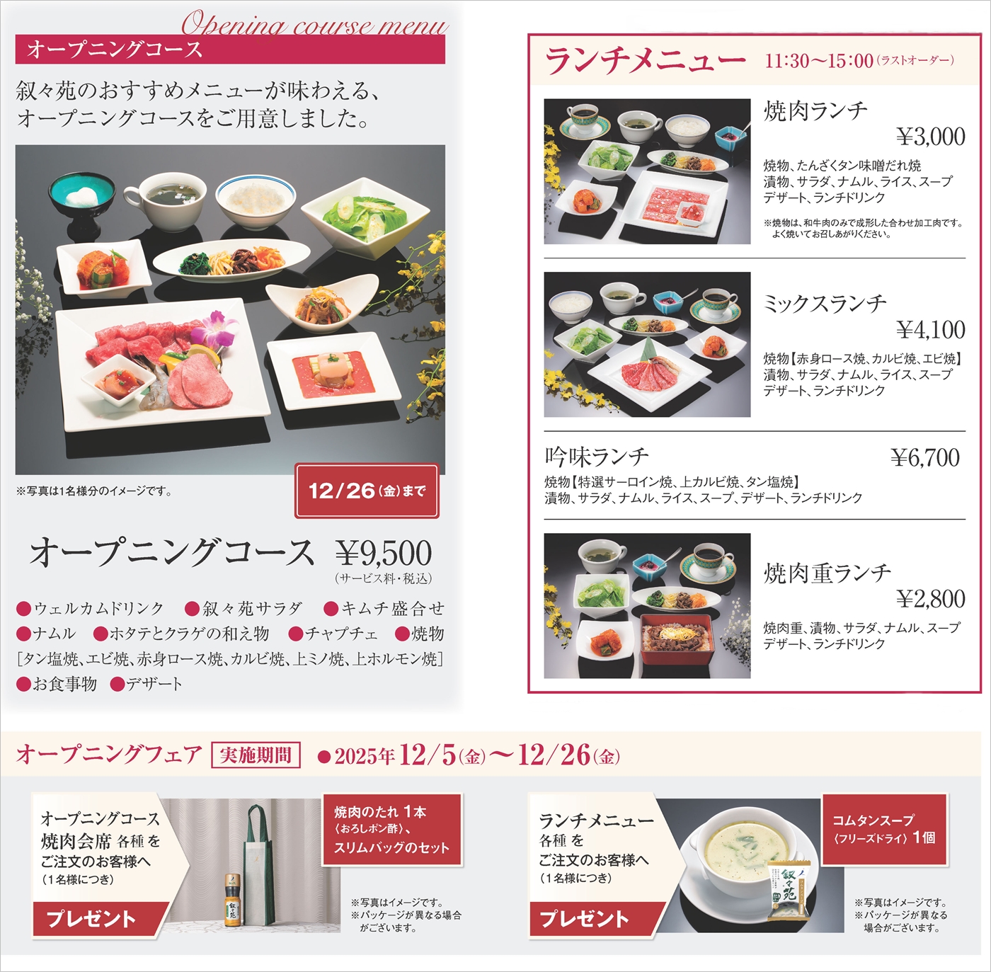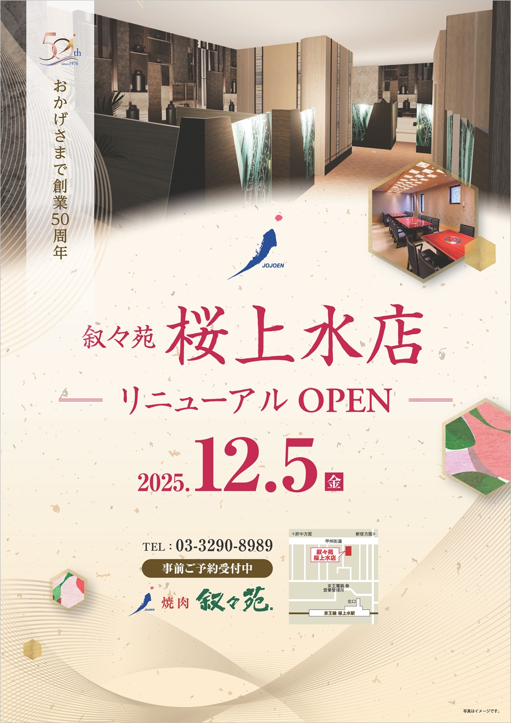 2025年12月5日(金)11時30分より叙々苑 桜上水店がリニューアルオープンいたします。